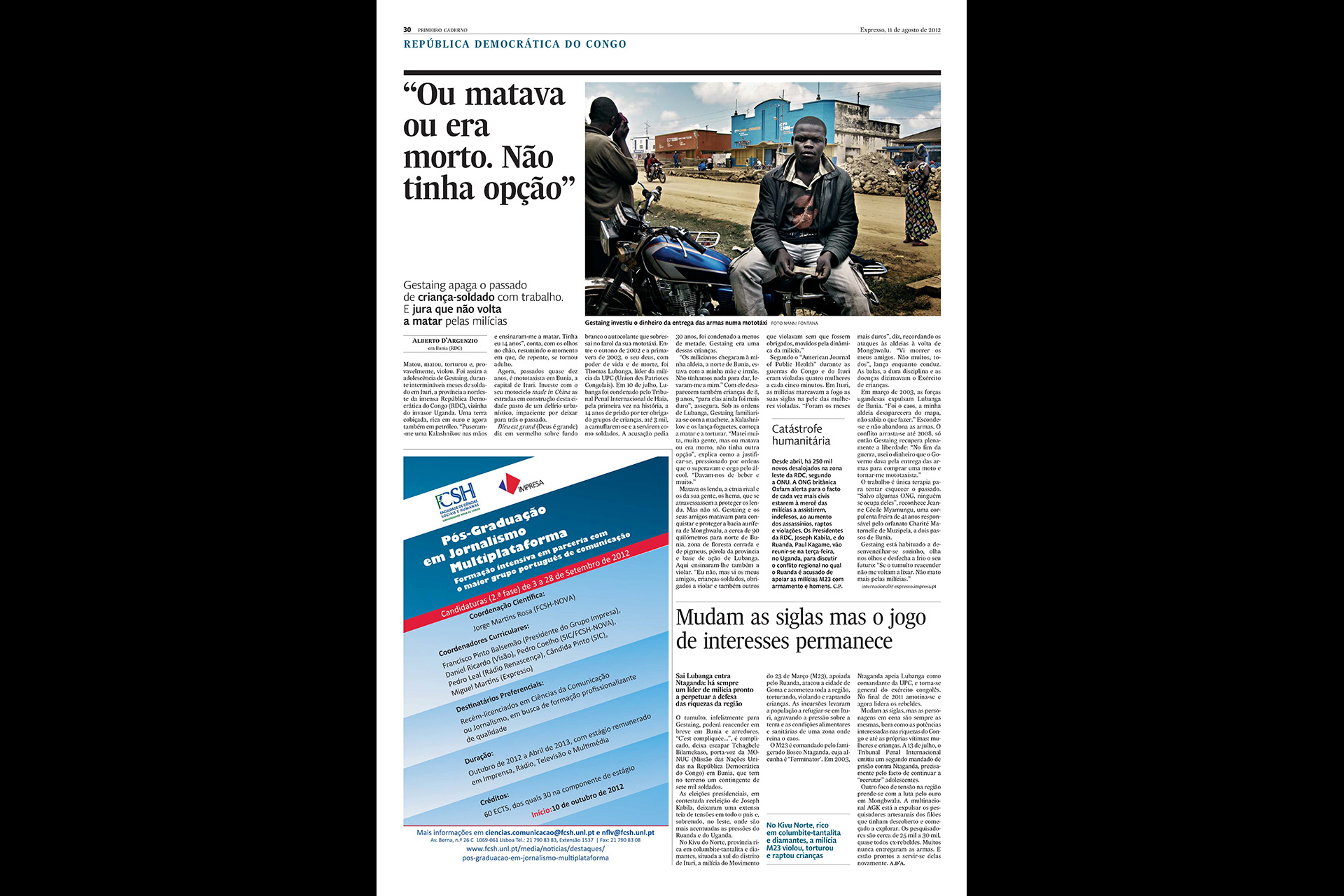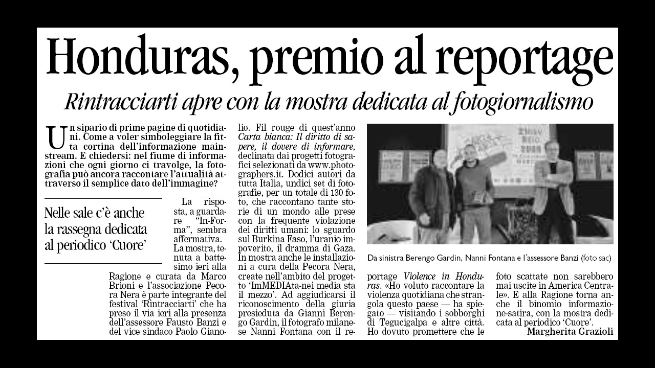 The following gallery is a collection of selected "notes" related to my work on the field: tear sheets of single pictures or stories that I've published on newspapers and magazines, articles about my long term projects, exhibitions' and talks' posters or just anything that lets me keep you updated on what's going on in my professional life.